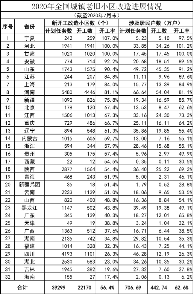 住建部指出,全國各地認真貫徹落實《國務院辦公廳關于全面推進城鎮老舊小區改造工作的指導意見》精神,加快推進城鎮老舊小區改造。根據各地上報情況匯總統計,按小區數計開工進展較快的地區:寧夏107%,河北100%,甘肅100%,安徽92.2%,山東90.4%;開工進展較慢的地區:福建32.3%,四川26.3%,湖北23.0%,吉林19.6%,海南17.4%。